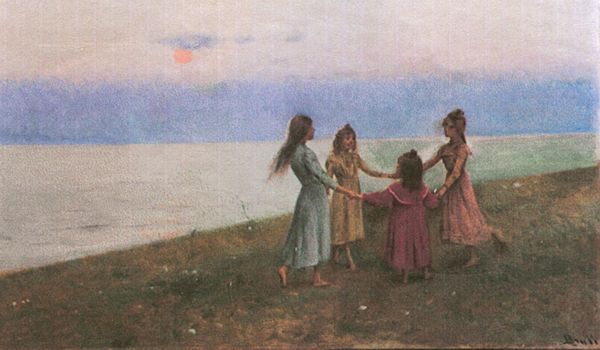 Pasquale Celommi made this painting, Primavera, whenever, with paint. Look how the grass is rendered, like tiny green commas laid out in a smooth carpet. It’s pretty wild how the artist has handled the paint, so controlled in some areas, especially the figures, and looser elsewhere. Check out how the red of the corset pops. It's pretty intense! The figures feel solid and real, whereas the green feels a little more fluid, like a dream. It's really all about the green here, isn't it? It’s like the figures are emerging out of greenness. This way of balancing detail with looseness reminds me a little of Corot, who was doing similar stuff a little earlier. What a painter, what a painting!
