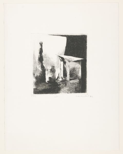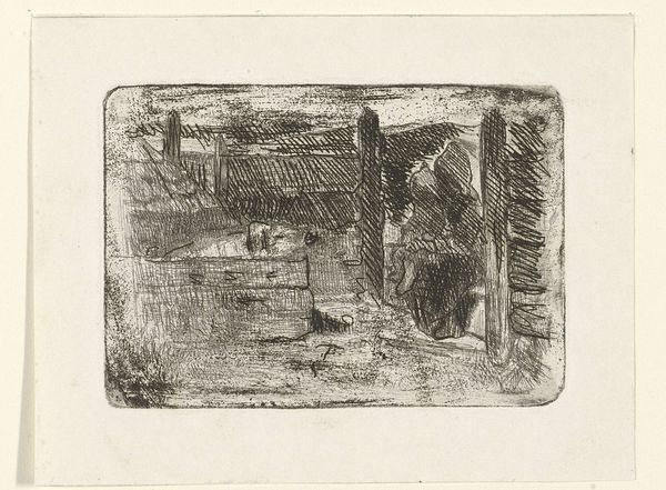 Editor: So this is Stephen Parrish’s etching, "An Etcher’s Studio," from the 19th century. The tones are so muted and the detail is incredible for such a small print. What I find really evocative is the lone figure at work inside, like a hidden world. What do you see in this piece? Curator: I see the symbolic weight of artistic creation itself. The etching depicts not just a physical space, but also a mental space, wouldn't you agree? Notice how the figure is positioned at the center, bathed in light from the window, almost haloed. It is like he's a vessel, receiving and transmuting light—inspiration—into art. Editor: That's beautiful! I hadn't thought of the light as a symbol in itself. Is the clutter around him symbolic too? Curator: Indeed. The seemingly random placement of objects—the easel, the canvases, the tools—aren’t simply 'clutter.' They are signifiers of the artistic process, representing the trials, errors, and experiments inherent in creating something new. The shadow behind him is equally evocative of the creative process; even light generates shadows in the human realm. And the drapery hanging from above has echoes of theatrical curtains - as if stepping onto a stage. Editor: Like the artist is performing an act of creation? That’s fascinating. So even a seemingly straightforward genre scene is packed with this symbolic language? Curator: Exactly. It prompts us to consider: what is the artist truly 'etching' onto the plate? It is more than just lines. He is etching a piece of his soul, influenced by culture, surroundings, and psychological experience into the metal. Look carefully—the artist himself is silhouetted - we do not see his expression. The image quietly encourages us to consider the burden and the rapture of transforming experience into images and art. Editor: I'll definitely look at genre scenes differently now. I appreciate seeing the symbolism in everyday images. Curator: My pleasure. Parrish’s “Etcher’s Studio" isn’t merely a snapshot. It's a mirror reflecting our enduring fascination with where art comes from.