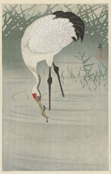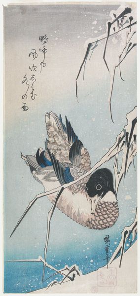 Curator: I'm struck by the delicate tranquility of this woodblock print, titled "Two Wild Ducks in Flight." It was created by Ohara Koson sometime between 1900 and 1936. Editor: Immediately, the cool greys and whites give a sense of stark, almost mournful solitude, heightened by the visible snowfall. The composition, with the birds seemingly caught mid-flight, reinforces a feeling of precariousness. Curator: The symbolism within Ukiyo-e prints often relates to the natural world's continuous cycles and our place within them. Birds, and especially ducks, can symbolize fidelity and conjugal affection within East Asian cultures. Koson, though, creates ambiguity here. Their flight path suggests displacement, perhaps, and hints at disruption to traditional gender and social structures. Editor: And those snow-covered reeds below... they speak to endurance and resilience, don't they? Reed imagery, especially in Japanese art, holds a weight of cultural memory linked to winter landscapes and nature's dormancy, even in the face of harshness. Perhaps Koson implies a kind of tenacious continuity in the face of broader societal flux. Curator: Exactly! And given the print's potential timeframe, we can certainly situate these ducks within the backdrop of Japan’s rapid modernization and its relationship with nature, art, and culture. Editor: The image almost feels incomplete, prompting deeper thought regarding where these ducks are migrating to and how they may reflect ourselves and society. The absence of context invites layers of narrative to be overlaid. The flight and reeds both endure, both weather the snowfall – each acts as an emblem of continued life under pressure. Curator: Ultimately, I think Koson asks us to consider the resilience necessary to thrive in evolving times and societal norms. Editor: A beautiful visual poem on endurance and the subtle dance between cultural symbolism and lived experiences!