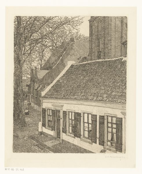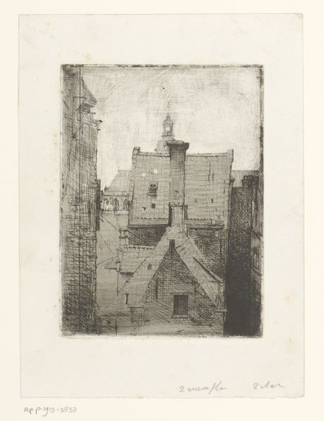 Piet Verhaert made this etching of rooftops and a church steeple. The low vantage point provides a view of the ordinary, a perspective not often seen in grand history paintings displayed in the Salons, or official art exhibitions. During Verhaert's time, the art world was increasingly divided between traditionalists and those seeking new ways of seeing and representing the world. Etchings like this offered artists a medium for exploring everyday life, often with a focus on urban environments. This print, with its attention to the texture of the rooftops and the subtle gradations of light, aligns with the Realist movement, a school that often challenged the established academic norms. It also demonstrates an appreciation for the unassuming beauty of the industrial age. To fully appreciate Verhaert's work, one might look into the prints and urban landscapes produced in the Netherlands and other European cities.