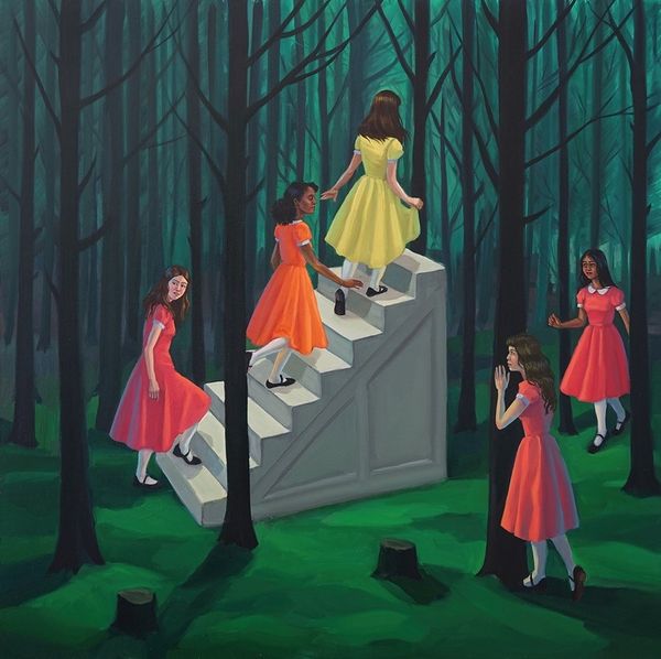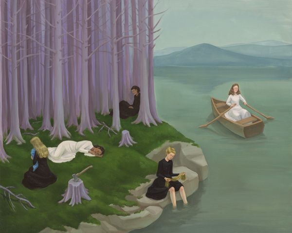 Zoe Hawk made this painting called "Dreaming As The Summers Die" sometime in the 20th century, and it feels like stepping into a half-remembered dream, doesn't it? There's a calculated flatness to the painting, and the colors are so deliberately chosen. They remind me of picture books. Hawk isn't afraid of narrative, and I like that. The paint application is smooth, almost like a sign painter’s touch, which distances us a little, making the scene feel both familiar and unsettling. Look at the girl digging in the yard. There's a tension between her activity and the static, almost theatrical, scene inside. It's like two worlds colliding, or maybe it's just the inside and outside of our minds. This reminds me of Balthus, but with an undercurrent of something more modern and knowing. Ultimately, the painting thrives on its ambiguity, allowing us to wander through its strange landscape and find our own meanings.