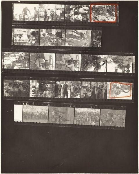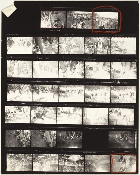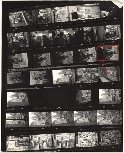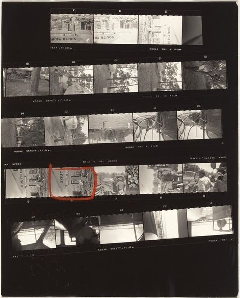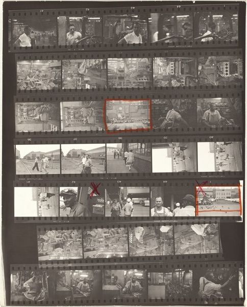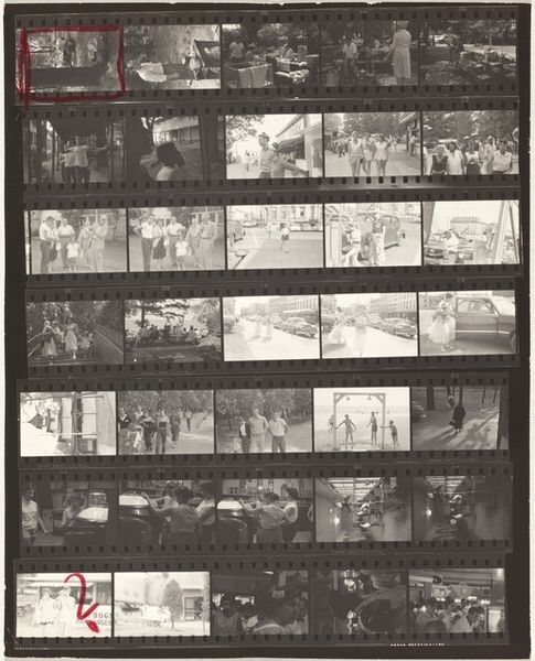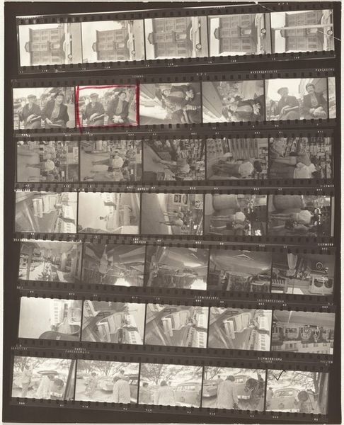Editor: So, this is Robert Frank's "Guggenheim 576—near Los Gatos, California" from 1956. It's a contact sheet from his time as a Guggenheim fellow, all those little glimpses captured in film. The red marks indicating chosen frames really jump out at me. It feels very raw, unfinished, like we’re seeing the artist's selection process. What do you see in this piece? Curator: Well, the contact sheet itself functions as a kind of unintentional window into Frank's editorial decisions during a pivotal moment in American photography. The Guggenheim Fellowship was crucial to his project of documenting America. The selection and rejection become politically charged choices about representation. Editor: Politically charged? How so? Curator: In the context of the 1950s, documentary photography carried a lot of weight. Frank was a Swiss immigrant, an outsider, and he wasn't necessarily reinforcing the established, idealized image of the American Dream. His choices of which images to discard and keep show a clear intention to show a different America. Why do you think Frank chose photography over other forms of documentation? Editor: Photography’s supposed to be objective, right? Maybe he wanted to subvert that objectivity. But a contact sheet shows so much more than a single photo can. Curator: Precisely. And the presentation matters! This isn't a glossy print; it's a work print, offering a peek behind the curtain, showing how a vision of America was actively constructed, and in a way that implicated himself in the act of observation. He questions the presumed objectivity that photos are known to bring, almost as if hinting that seeing is itself a subjective act. Editor: That's fascinating, framing the artist's choices themselves as a political statement. I hadn't thought about how even the selection process could carry so much weight. Curator: Seeing the photographer in his political and cultural context can allow new ways of relating with the imagery they captured, for instance, by understanding the institutions framing art.