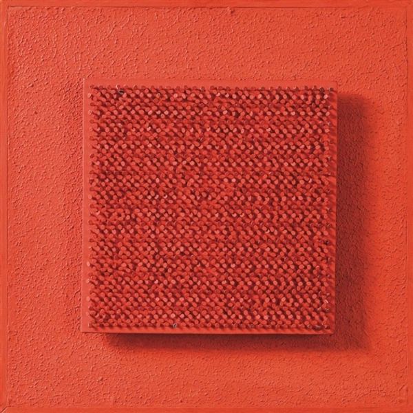 Curator: This is Jacqueline Winsor's "Inset Wall Piece Gray with Maroon Interior," a small, intriguing sculpture housed at the Harvard Art Museums. It's about 11 inches square. Editor: Immediately, I’m struck by the contrast. The cool, almost sterile gray of the exterior frame against the deep, textured maroon interior creates a sense of hidden passion or suppressed emotion. Curator: Winsor often employed rudimentary materials and repetitive, labor-intensive processes. Consider the way this piece challenges traditional notions of sculpture by incorporating a recessed space. The labor to produce a piece like this is worth considering. Editor: Absolutely. The labor here speaks volumes. The inset, with its dark interior, feels almost like a secret, inviting reflection on themes of privacy, hidden histories, and what we choose to conceal within societal structures. Curator: I appreciate the way you interpret the themes. The work’s power stems from its emphasis on process and raw materials. Editor: Perhaps, but it’s the intersection of material and meaning that resonates with me. It's a quiet piece, but its implications for identity and internal struggles are profound. Curator: A solid point, it has been interesting to unpack Winsor's methods and meanings today. Editor: Indeed, art always offers multiple entry points for understanding.