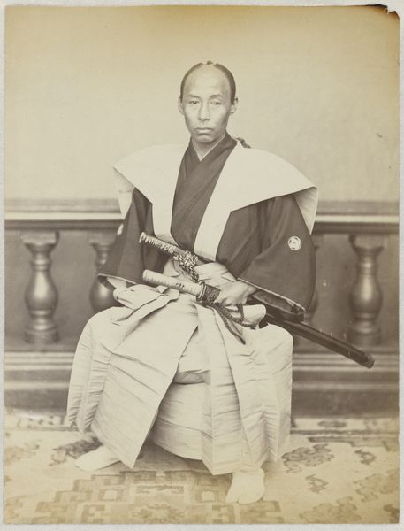 Curator: Standing before us is an albumen print from between 1868 and 1872 by Woodbury & Page, a portrait titled "Pakoe Boewono IX, Susuhunan van Surakarta." Editor: He's got a very intense stare, almost like he's peering right through me! It's a striking composition, with a narrow depth of field, really focusing your eye on his face and that…regal headpiece. Curator: The gaze is captivating, isn’t it? These albumen prints were incredibly popular then for capturing ethnographic studies and portraits of nobility. This image of Pakoe Boewono IX serves as both, demonstrating the European fascination with Javanese aristocracy under Dutch colonial rule. The sharp detail comes from a technique known as collodion wet plate photography. Editor: Oh, so there was a lot of technology involved with this shot back then. It feels very different than if this were done today, with something more instantaneous and digital. Look at the details of the clothing! It’s fascinating what can be picked up on so precisely. But in his expression I see some ambivalence in this portrait; a sense of caution in the eyes… or is that just me? Curator: No, I agree. The political complexities were substantial. The Dutch sought to legitimize their rule by showcasing the power—and implicitly, the acquiescence—of local rulers like Pakoe Boewono IX, yet these very images also fostered a sense of Javanese cultural pride and identity. So it represents an attempt at preservation amid political power struggles. The gaze may show the weight and understanding of a careful political negotiation during that time. Editor: I never thought about photography in this way before. It’s not just about the person but about the whole set of relationships involved and the message conveyed, too. I feel I understand a piece of the Javanese culture now. This really is such an eloquent and engaging snapshot from a complex colonial intersection. Curator: Precisely, it's a window into a moment of immense cultural and political negotiation. The visual story speaks of imposed rule but also indigenous identity and how the technology became part of those negotiations.