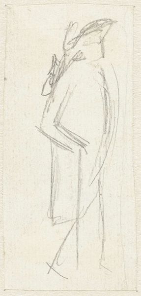 Editor: This is "Standing Man, Facing Left," a pencil drawing created sometime between 1770 and 1825 by Simon Andreas Krausz. There's something so raw about the sketch – unfinished, almost ethereal. What strikes you when you look at it? Curator: Oh, this fella! I like to imagine he's just wandered off the pages of some forgotten Romantic epic, staff in hand, lost in contemplation. The beauty lies in the understatement, wouldn't you agree? See how Krausz captures the essence of form with so few lines. It's like he's whispering the man into existence. Does the figure look forlorn to you at all, perhaps contemplative of some coming woe? Editor: Yes, there's a definite sense of solitude. The quick strokes give the impression that the artist wanted to capture the figure quickly and that maybe the man would suddenly get up and go! But beyond that, I find myself wanting more detail, wanting to know the rest of the story. Is he a traveler, a philosopher, a beggar? Curator: Aha! That longing *is* the point, perhaps? This little sketch isn't about telling us everything; it’s about hinting, suggesting, making us, the viewers, complicit in the narrative. Look at the posture – there’s a subtle lean, an indication of weariness, maybe? It's like the artist is inviting *us* to write his history. Does the use of just one colour make this drawing better, or would different shading have elevated this image? Editor: I see what you mean! That's a fantastic point! I was so focused on the lack of detail that I didn’t consider how that openness actively involves the viewer. Thanks for opening my eyes! Curator: My pleasure! Now go forth and fill those art history papers with untold stories!