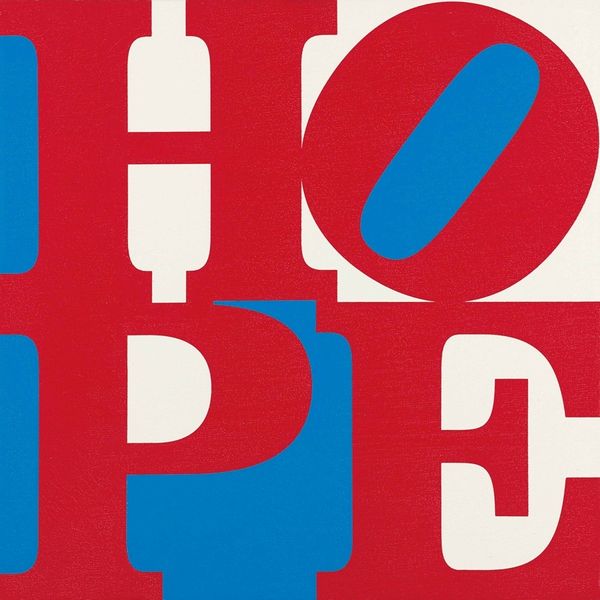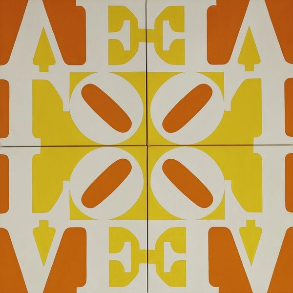 Robert Indiana created *Book of Love #6* using screenprint. Notice how the simple arrangement of the word 'LOVE' immediately grabs your attention with its bold colours and geometric precision. The square format is neatly divided into quadrants with an arrangement of colours and shapes that create a sense of balance. Each letter is carefully placed, with the 'O' playfully tilted, breaking the symmetry and adding a touch of dynamism. Indiana’s work is steeped in semiotics, where each colour and shape acts as a sign. The flat, unmodulated colours – blue, red, and yellow – evoke the Pop Art movement, reflecting the culture of mass production and consumption. Yet the word itself, 'LOVE', brings an emotional depth, complicating the surface with a universal human experience. By abstracting and simplifying language, Indiana challenges fixed meanings, inviting us to consider how signs and symbols shape our understanding of the world and our most profound emotions.