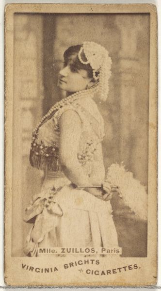 Curator: This is "Carmencita," a photograph, print and drawing dating between 1890 and 1895. It comes to us from W. Duke, Sons & Co. as part of their Actors and Actresses series. Editor: Ooh, she's giving me fierce matador vibes mixed with, like, a cheeky wink to the camera. I wonder what kind of stories those eyes could tell! The sepia tone sort of amplifies that old-world, slightly mysterious aura. Curator: Indeed. What we observe is a prime example of pictorialism, particularly in its aesthetic approach. Notice the careful attention paid to tonal range and the subject's theatrical pose. The intention seems to evoke a mood rather than simply documenting reality. Editor: Absolutely. I dig how the layers of her costume create such a lush, tactile experience even through a photo. All those frills and patterns feel alive somehow. But is it just me, or is there a faint sadness lurking beneath her performative energy? Like she's putting on a show, but there's more going on behind the curtain. Curator: That tension you perceive might stem from the artwork's semiotic encoding. Carmencita, presented in a manner both celebratory and subtly commodified, becomes a symbol of performance, spectacle, and perhaps even the complex negotiations of identity within the public sphere. Editor: Ah, so she's like, a walking metaphor. That makes sense. I’m also thinking, in those days, the accessibility of photos like this must've offered people a tangible connection to these glamorous figures. Talk about democratizing fame! Curator: Precisely. These mass-produced images offered an accessible point of engagement, reframing celebrity and artistry within the context of consumer culture. Editor: Well, Carmencita's definitely captured my attention, hook, line, and sinker. Makes you ponder the personas we create and the stories we choose to share—or maybe conceal. Curator: A poignant reflection. Viewing "Carmencita" provides insight not only into photographic techniques, but also social structures and the performative aspects that comprise human experience.