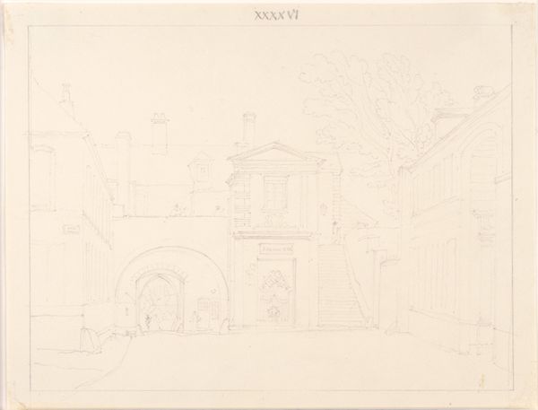 Editor: This drawing, "View of a Courtyard" by Karl Ludwig Wilhelm von Zanth, dates back to around 1830. It's a pencil drawing, quite detailed actually. What strikes me most is its incredible lightness, almost ethereal quality, achieved through the delicate linework and subtle gradations in tone. What do you see in this piece? Curator: Primarily, I observe the dominance of line. Zanth uses it not merely to delineate form but to construct an intricate spatial framework. Consider how the converging lines of the courtyard direct the viewer's eye deep into the composition. Do you notice the geometric clarity with which the architectural elements are rendered? Editor: Yes, I see the precision in the architectural drawing. But it still feels... airy, not as rigid as I would expect from neoclassical art. Curator: Indeed. The artist subtly deviates from pure neoclassical rigidity by introducing softer, organic elements. Note the trees, how they offer a contrast to the hard lines of the buildings. Also consider how the perspective functions; while rationally constructed, it serves an aesthetic, rather than a purely representational goal. Editor: That's a really good point, I hadn't thought of the perspective as being expressive in itself! It’s like the precision serves a greater artistic vision, not just a literal depiction. Curator: Precisely. And by emphasizing formal structure, Zanth transforms an ordinary courtyard into an object of contemplation, prompting viewers to analyze space, line, and form, leading to an enhanced aesthetic experience. Editor: I definitely see that now. I came in thinking about the atmospheric perspective, but the way the lines and shapes all interact is what really makes the piece. Curator: Well put. Studying how artists organize these components—space, line, and form—is fundamental to art historical inquiry and interpretation.