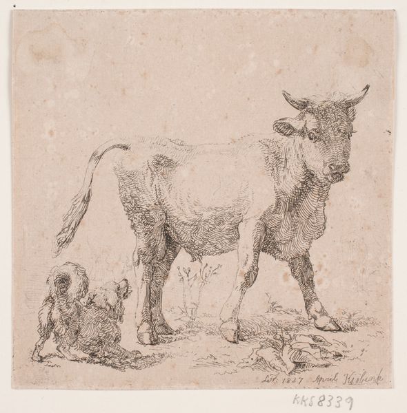 Johannes Wilhelm Zillen created this etching, "En ged med sit kid," during the mid-19th century, a period marked by significant shifts in European society and art. Zillen, working within a world increasingly shaped by industrialization and urbanization, turned his attention to the pastoral, capturing the intimate bond between a goat and its kid. His choice of subject matter invites reflection on themes of motherhood and the natural world, perhaps as a gentle counterpoint to the rapidly changing social landscape. Consider the emotional weight of depicting a mother and child, even within the animal kingdom. Does it evoke a sense of nostalgia for a simpler, more agrarian past? While seemingly straightforward, Zillen's etching subtly touches on broader societal values and anxieties of his time. It’s a quiet reminder of the enduring power of familial connection amidst upheaval.