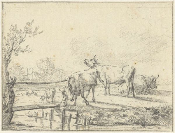 Pieter de Goeje made this drawing, 'Landschap met man met koe', with pen in gray ink. De Goeje lived during a period of significant social and political upheaval, including the Napoleonic Wars and the subsequent reshaping of European boundaries. While ostensibly a pastoral scene, the artwork evokes the complex relationship between humans and the natural world. The image prompts consideration of the labor and lives intertwined with agricultural landscapes and the role of animals within agrarian economies. De Goeje’s landscape does not hide the realities of rural life; instead, it invites an appreciation of the delicate balance that existed, and continues to exist in many parts of the world, between human society and its environment. The muted tones and the seemingly quiet moment captured can be viewed as a mirror reflecting our own place within larger ecological and historical contexts.