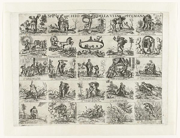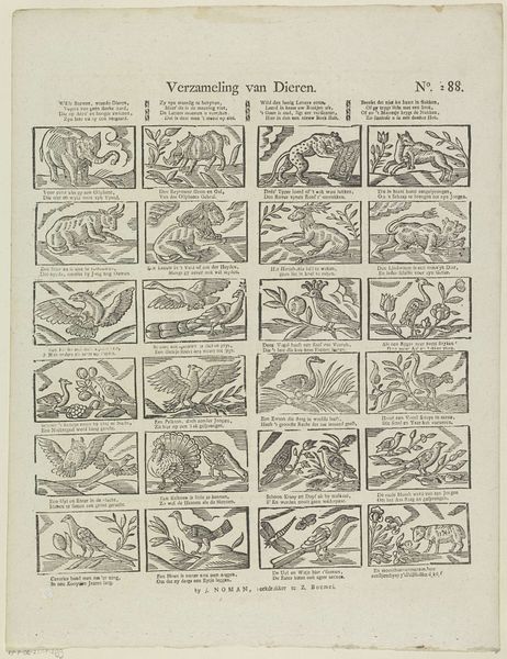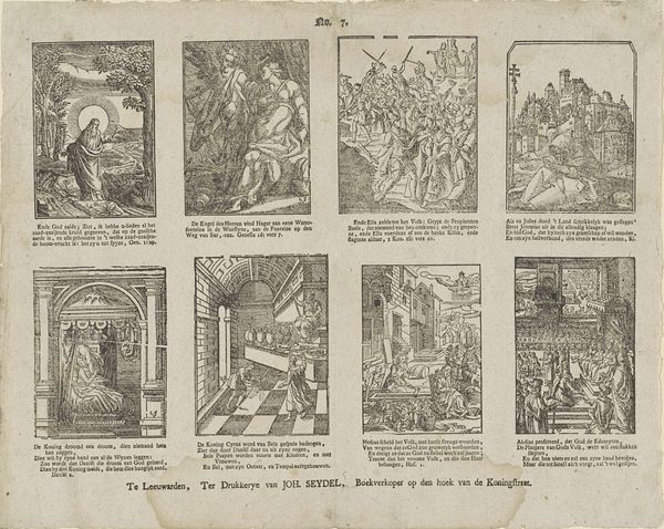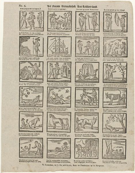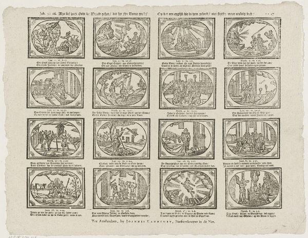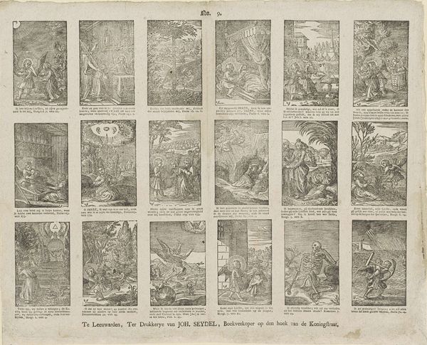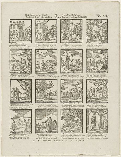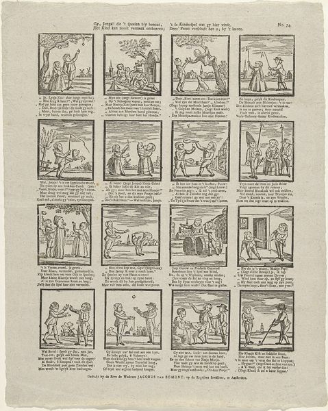 Editor: This print, "Wil deeze prentjens, met hun versjens, bestudeeren / Gy zult 'er zekerlyk niet weinig goeds uit leeren," dating from around 1806 to 1830 by Gerrit Oortman, is fascinating. The arrangement of the small scenes reminds me of a comic strip. What can you tell me about this piece in its historical context? Curator: The print functions almost as a didactic tool, showcasing morals for its intended audience through narrative and genre scenes, with accompanying verses written in early modern Dutch. These aren't simply charming illustrations. They actively engage with social values of the time. Consider the political backdrop, with shifts in power dynamics during the Napoleonic era. What role could prints like this have played in shaping public discourse, influencing behaviors, or reinforcing certain ideological positions? Editor: So, these scenes aren’t just meant to be decorative, they're deliberately trying to teach the viewer something about the world? Curator: Exactly. Think about how the print medium allowed these messages to be disseminated widely and affordably. The institution of public education was developing, so the widespread distribution of printed matter like this played a critical role in conveying moral and social norms to a broad populace. How do you imagine families would engage with these scenes at home, perhaps within a specific room or during a specific moment of the day? Editor: I guess it's a glimpse into the values and priorities of that time. I didn't think about that. Curator: Indeed. These images give us insight into what stories were told and what lessons were valued, revealing the values embedded in everyday life during a transformative historical period. It serves as an artefact of knowledge! Editor: Thank you. I see these seemingly simple pictures so differently now, in the context of cultural learning. Curator: You're welcome. It highlights how art, even in modest forms like this print, actively participates in the construction of collective understanding.