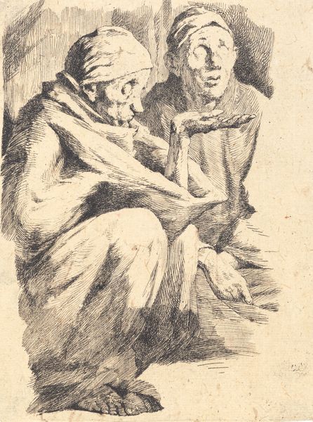 Honoré Daumier sketched these two men, mid body to the left, using graphite and ink wash. Daumier lived through the 1830 revolution in France, a time filled with social and political unrest. He was known for his caricatures, using art as a form of social commentary. These men, rendered in stark lines and contrasting shadows, seem caught in a moment of contemplation. The man in the foreground, hand to his face, appears to be in deep thought, while the figure behind him seems more like a shadow, perhaps representing the internal struggles or societal pressures that weigh upon the first man. Daumier often depicted the working class in his art. These men, with their worn faces and simple clothing, might symbolize the common man grappling with the challenges of their time. There is a sense of empathy in Daumier’s depiction, inviting us to consider their experiences and connect with their humanity. This piece reminds us of the silent battles fought within individuals, reflecting broader societal issues while resonating with personal emotion.