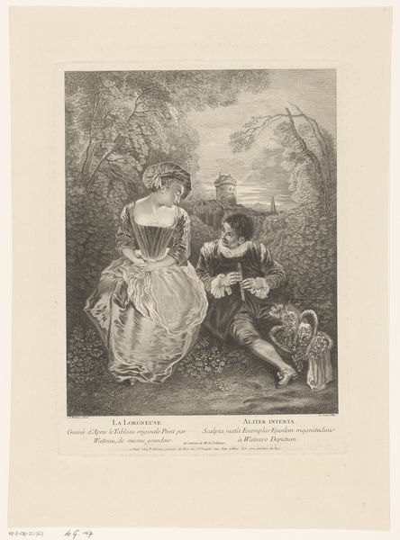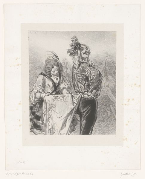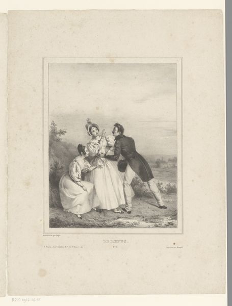 Editor: Here we have an engraving called "Man en vrouw houden elkaars hand vast in de buitenlucht," or "Man and woman holding hands in the open air," created between 1851 and 1865 by Célestin Nanteuil. I immediately get this romantic, melancholic vibe from the print. What catches your eye? Curator: Oh, this piece sings of a love both grand and grounded! What do I see? I see whispered promises under a sky that’s just seen a storm pass. See how they’re holding hands? Not just a grasp, it's a story, isn't it? The distant castle whispers tales of bygone eras, almost like it is overseeing the present state of affairs. Doesn't it just evoke this overwhelming desire for something deeply yearned? Editor: Absolutely! I noticed the castle too. Do you think it’s important to understanding their relationship? Curator: I do. The castle, with its slightly intimidating gothic silhouette, adds a layer of depth to the narrative, suggesting there is a grand story to discover behind their present meeting. Look at their clothing—slightly theatrical, wouldn't you agree? It hints at perhaps a staged meeting or stolen encounter? It seems almost staged! The setting itself adds an unreal layer to their meeting. It does prompt reflection about performativity, about seeing and being seen... Editor: The clothes do stand out! That theatrical aspect didn't occur to me before. So, it adds an intentional flair of emotion or perhaps, drama? Curator: Exactly. Like love itself, dramatic! I've never encountered anyone hold hands that intentionally and be like "It's only Platonic, bestie." And perhaps Nanteuil’s touch—the slight uncertainty, or the deliberate romantic styling—is how we come to really see love in all its forms. Editor: I'm now looking at their embrace, and I appreciate what their hand-holding suggests. Curator: It just holds… volumes, darling. Volumes! It's truly where the eye meets the heart, wouldn't you agree?