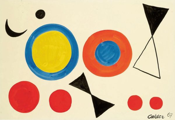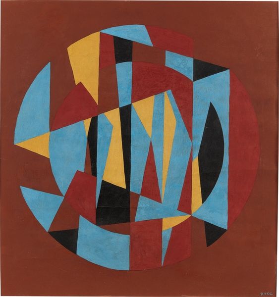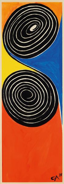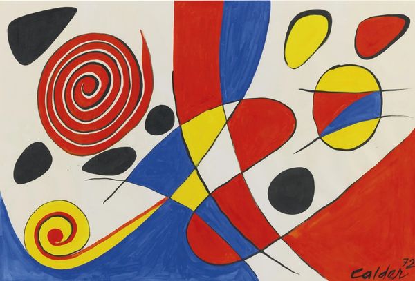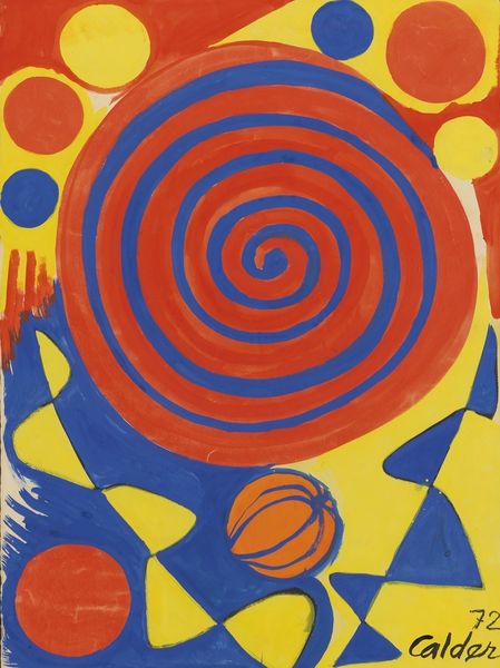 Editor: This is Alexander Calder's "Serpent au Vitrail" from 1970, an acrylic painting. The bright red background really makes the swirling, almost hypnotic, central form jump out. What do you see in this piece? Curator: Instantly, I'm struck by how Calder is repurposing the symbolic weight of the serpent. Historically, across cultures, the serpent is associated with wisdom, healing, but also chaos and deception. What happens when you place that primal symbol, the serpent, within the visual language of a stained-glass window - "vitrail" in French? Editor: So, it's a kind of... clash? The serpent, something ancient, represented in a very modern, almost Pop Art style? Curator: Exactly! The hard-edged, geometric shapes contrast dramatically with the serpent’s traditionally fluid form. Think about the symbolism of color here, too. Calder uses primary colours within a predominantly black matrix – reminiscent of the leading in stained glass. Editor: I see it. The colors almost look like…jewels embedded in black. Does that reinforce the stained-glass imagery? Curator: It absolutely does. This contrast creates a powerful tension. Calder is forcing us to reconcile the ancient and the modern, the sacred and the secular. And that slight imperfection in the circle gives the whole image a more organic feel, doesn’t it? Editor: Yes, I thought it was almost like it’s slithering. I really appreciate how knowing the symbolism enriches the viewing experience. Curator: Precisely! Calder’s 'Serpent au Vitrail' becomes more than just an abstract image; it’s a meditation on cultural memory itself.
