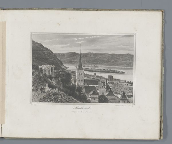 Curator: Here we have Carl Mayer's "Gezicht op Burcht Rheinfels en Sankt Goar," an engraving created sometime between 1822 and 1868. It depicts a sweeping view of the Rheinfels Castle and the town of Sankt Goar along the Rhine River. Editor: It’s quite evocative. The way the castle dominates the high ground—you immediately feel a sense of hierarchy and power. The overall atmosphere feels both peaceful and imposing. Curator: Indeed. Mayer was working within the Romantic landscape tradition, and here, we can see how the genre reflected broader cultural anxieties regarding societal hierarchies and individual identity in relation to nature. Notice the lone figures in the foreground—they seem dwarfed by both the landscape and the imposing castle. Editor: Absolutely. And the castle itself! Think of castles as powerful symbols representing not just authority but also a yearning for a return to an imagined, heroic past. That architectural mass becomes an anchor point for stories about governance and military strength, even dominance. Curator: Precisely! Consider also the positioning of the river, dividing the world. How does access or denial of access to that natural resource mirror socio-economic power dynamics in that period? Who controls the trade route, and who is excluded? Editor: A compelling question. Also, the image is black and white, drawing greater attention to detail. Even the shading serves to underscore specific objects as the picture guides the viewer on what to appreciate within the image. Curator: Yes, and it is in these delicate renderings of power and historical narrative that Mayer challenges viewers to confront the complexities of history itself. Romanticism does not always serve truth. Editor: A critical point! Considering the layering of symbols here provides a way to tap into cultural memory. Castles still mean something even today. Curator: Well, exploring Mayer's print through these intertwined lenses certainly enriches our viewing experience. Editor: Absolutely. The past, the present, symbols of enduring power: much to contemplate in a single image.