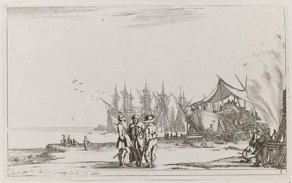 Editor: This print, "Arrival of the Slave-Trader (?) in Venice," by Melchior Küsel, is striking, wouldn’t you say? It's so incredibly detailed. What do you make of its… well, frankly, its unsettling ambiguity? Curator: Ambiguity is a kind word. It speaks volumes about the artist, doesn’t it? Küsel presents a Venice teeming with life, yet the suggestion of the slave trade casts a long shadow. Look at the body language – the laborers, the detached onlookers. The lack of clarity forces us to confront uncomfortable truths about the past. Is it a celebration or a condemnation? Perhaps both, existing in the same breath, like a sigh. Editor: So, it’s the tension that gives it power? Curator: Precisely! It invites you into a dialogue. It reminds us that history isn't always neat or easily digestible, but a tangled, messy affair. Editor: Well, I’ll certainly be thinking about this one for a while. Curator: As will I.