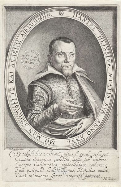 Curator: Editor: Here we have Hendrick Goltzius's "Portrait of a 32-Year-Old Man against the Background of an Oak Leaf," from 1579. It’s an engraving, and there’s something almost unsettling about the level of detail he achieves. What do you see in it? Curator: I’m immediately drawn to the materiality of this print, and what it tells us about 16th-century artisanal production. Goltzius, first and foremost, was a master engraver. How do you think the production process influences the message conveyed? Editor: Well, I hadn't really thought about that. It strikes me that he’s deliberately chosen printmaking to depict this gentleman. Maybe to democratize the image and mass-produce and disseminate it, thereby increasing social status. Is that feasible, though? Curator: Absolutely! Engravings allowed for wider distribution, signifying status through reproduction. Also, consider the engraver's labor involved in each print, replicating the image repeatedly. How might the act of repetition play into the art's meaning, beyond mere distribution? Editor: Perhaps the act of meticulously re-creating the portrait mirrors the sitter's desire for permanence or memorialization? It adds a layer of intention. Plus, the oak leaf backdrop now seems less ornamental and more related to its presence as a sustainable material object... Curator: Exactly. The very act of creating multiple identical impressions underscores themes of permanence and legacy but also considers the economy of materials inherent in printmaking versus say, painting. This engraving provides more access for others than a traditional oil on canvas may offer... Editor: I see now. It is like how modern factories produce hundreds of the same car; the choice of medium allows for democratization of status... I would never have thought of the printing itself adding to the work's message without you. Curator: It is the way the medium is intricately tied to not only status but Goltzius' commentary on the same. He isn't simply depicting an image, he is actively producing a means by which ideas of status were actively reproduced and negotiated, especially between artists and their benefactors.
