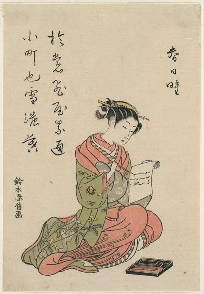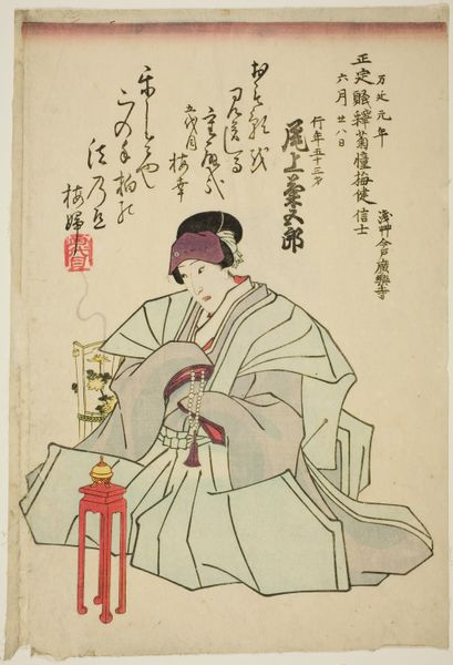 Curator: Looking at this print, I immediately feel this sense of quiet reflection, almost sadness. It's in the posture, the downcast gaze... there's a gentle weight here, wouldn't you say? Editor: Absolutely. What you're sensing speaks directly to the commemorative nature of the artwork. This is Utagawa Toyokuni I’s "Memorial Portrait of the Actor Ichikawa Monnosuke III," dating back to 1824. It is currently held at the Art Institute of Chicago. It is a woodblock print using ink and color on paper and serves as a poignant cultural artifact, a "ukiyo-e" print. It exists at the nexus of artistic expression and memorial. Curator: A memorial! Now the sorrow makes perfect sense. I can imagine how grief and admiration might swirl when remembering an actor so vividly. It almost feels like I can glimpse into his heart or the legacy he left. Do you think the gentle pink colors add a touch of sweetness amidst grief? Editor: Yes, that soft pink robe with the water and floral motifs softens the edges of death while still hinting at worldly existence. Think about the social context here; Kabuki actors, while popular, often existed on the margins of society. Memorial prints like this were powerful acts, enshrining their cultural significance and providing some form of immortality for the actor within the broader cultural imagination. The inscription to the right includes biographical information on Ichikawa Monnosuke III. Curator: So this portrait served as both a memento and an act of resistance, perhaps? Given his position on the margins, commemorating him normalizes his existence, while enshrining the fleeting nature of fame itself. And to think all these complex ideas could spring from an image! Editor: Precisely. These prints circulated widely. This wasn’t just a private mourning; it was a very public statement. Understanding this provides insight into socio-cultural acceptance of actors, theatre as an art form, the ephemeral nature of performance, and death. Curator: So we have an artwork that speaks to remembrance, fleeting beauty, social status, and cultural shifts. Not bad for a single image! It gives me a fresh view on Ukiyo-e prints in general. They're more than pretty pictures, they capture entire worlds. Editor: Agreed. Examining the cultural significance and intersectional nature of Utagawa Toyokuni's artistic endeavors really encourages us to consider how artistic portraits are never only portraits, but multifaceted artifacts laden with nuanced meanings.
