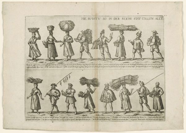 Frans Hogenberg created this print of thirty-six street vendors in Cologne sometime between 1540 and 1590. Hogenberg’s detailed engraving captures the hustle and bustle of 16th-century urban life. Each figure, rendered with a keen eye, offers a glimpse into the economic activities and social strata of the time. Consider how gender and class are intertwined here. Women, often burdened with heavy loads on their heads, engage in physical labor that mirrors but also contrasts with the trades of men. The almanac and newspaper vendors also point to the rise of literacy and the spread of information, reflecting a society undergoing significant change. This print is not just a historical document, but a testament to the resilience and resourcefulness of ordinary people who shaped the urban landscape. It invites us to reflect on the labor, the commerce, and the stories embedded in the everyday lives of those who came before us.