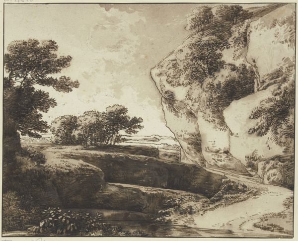 Editor: This is "Tree," an ink drawing by Paul Bril, housed in the Städel Museum. It evokes a sense of timelessness with its muted tones and detailed lines, doesn't it? I'm curious, what stories or historical undercurrents do you see in this landscape? Curator: What I see is Bril's negotiation of nature and the historical forces shaping our understanding of the landscape. This drawing invites us to reflect on the power dynamics inherent in how we perceive and represent nature, specifically through the lens of a Northern-Renaissance artist grappling with their place in the world. Can you see how the composition both romanticizes and monumentalizes the natural world? Editor: Yes, it feels carefully composed. There is an idyllic quality. But I wonder if we are meant to question this ideal? Curator: Exactly. The very act of selecting, framing, and representing this landscape implicates Bril, and by extension us, in a particular ideology. Who gets to define "nature," and for what purposes? Consider the social hierarchies inherent in landscape ownership, land use and who has the privilege to contemplate a “pretty vista.” Editor: I never considered that before, thinking about landscape art in that context. It’s much more than just a nice view. Curator: Precisely. And it's crucial to acknowledge these biases and engage in critical dialogue with art, using intersectional lenses to fully understand its complex relationship with history, power, and representation. So, the next time you encounter a landscape, consider the perspective and what remains unsaid. Editor: Thanks, I will definitely think about that. I've gained a new appreciation for the historical and societal weight that landscapes carry!