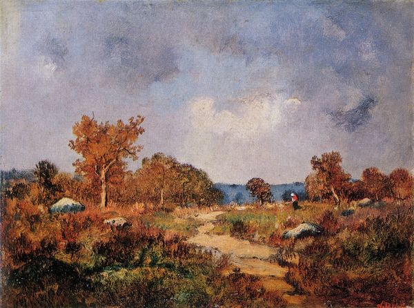 Théodore Rousseau's "Lande de la Glandée, Forest of Fontainebleau" is an oil painting, a medium closely tied to the history of artistic expression since the Renaissance. Here, Rousseau uses the materiality of oil paint to capture the feeling of a real place. Look at the textures he creates. The impasto in the sky, the fine strokes in the trees, the layered brushwork in the heather. He seems to have spent a considerable amount of time working ‘en plein air’, that is, outside, observing the landscape directly. The very act of painting outdoors was radical in the 19th century. It was a break from the academic tradition of composing landscapes in the studio. It was also a direct response to the rise of industrialization. Artists like Rousseau were drawn to the countryside as a refuge from the increasingly mechanized world, seeking authenticity in nature and simple, direct modes of production. "Lande de la Glandée" therefore becomes more than just a picture; it embodies a social and cultural moment, a turning point in how artists saw their relationship to the world.