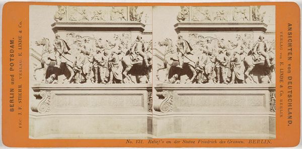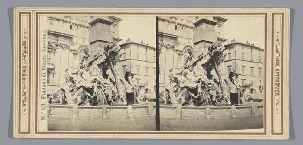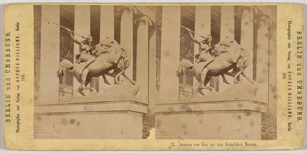 This stereo card presents a photograph taken in 1876 by Sophus Williams, depicting Albert Wolff's sculpture, “Lion Slayer” in front of the Altes Museum in Berlin. The composition is dominated by a powerful diagonal thrust, from the base of the monument, up through the rearing horse and rider, to the spear pointed skyward. The textured surfaces of the sculpture contrast with the smooth, vertical lines of the museum's classical columns behind. The figures are frozen in a moment of violent action, yet the photograph stills the dynamism of the original sculpture. This contrast between movement and stillness encapsulates the complex play between the sculptural form and the photographic medium. The use of light and shadow enhances the three-dimensionality of the sculpture, underscoring the tension and drama inherent in the scene. The photograph not only captures the formal qualities of the sculpture but also translates its heroic narrative into a new visual language.