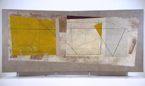 Editor: Looking at Richard Diebenkorn’s “Red-Yellow-Blue” from 1986, I'm struck by its seemingly simple composition of geometric forms rendered with what looks like colored pencils. It gives off a playful, almost childlike, yet carefully considered feeling. How would you interpret this work, particularly in relation to the artistic and cultural trends of the time? Curator: This work represents a late period for Diebenkorn, a time when he moved from his celebrated "Ocean Park" series toward a more distilled geometric vocabulary. Abstraction, of course, wasn’t new in 1986, but Diebenkorn's approach stands apart. Considering its historical moment, after the high seriousness of abstract expressionism, and amid the rising market spectacle of Neo-Expressionism, this print signals a kind of retrenchment. A return to fundamental questions of form and color, a quiet defiance of prevailing trends. Do you notice the subtle imperfections within the blocks of color? Editor: Yes, the hand-drawn lines and slight color variations definitely keep it from feeling too sterile. So it’s almost like he's deliberately embracing a less polished, more human quality in opposition to both the grand pronouncements of the past and the market frenzy of the present? Curator: Precisely. He seems to be consciously avoiding the heroic gesture of earlier abstract painters, and equally resists the commodification of art that was becoming increasingly prevalent. The work’s title, too, reinforces this intention: “Red-Yellow-Blue," it's a very basic and accessible declaration. We must consider, in this sense, how artists position themselves and their art, and against what artistic and social norms. Editor: That's fascinating! I hadn’t considered it as a quiet act of resistance. It makes me appreciate it on a completely different level. Curator: Indeed. By engaging with the history of abstraction and contemporary market forces, the work gains new layers of complexity and meaning. It encourages us to consider the choices artists make about form, medium and even title.