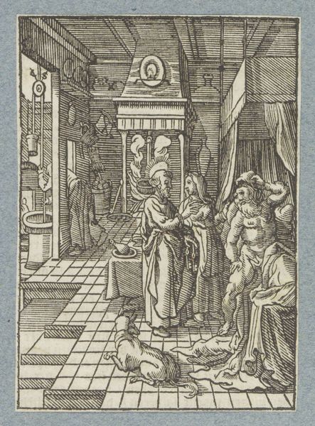 Christoffel van Sichem II created this woodcut print, "Tobit wordt blind," sometime in the early to mid-17th century. It depicts a scene from the Book of Tobit, a deuterocanonical text in the Bible. The image uses visual codes familiar to its time, like the clothing of the figures, to convey a sense of biblical antiquity and domestic drama. Van Sichem, working in the Netherlands, tapped into a cultural moment where religious narratives were often intertwined with daily life. The print's small scale suggests it was likely intended for personal devotion or as an illustration in a book, reflecting the growing literacy and availability of printed materials in the Dutch Golden Age. Its existence speaks to the institutions that shaped artistic production, like publishing houses and the market for religious imagery. Understanding the social and religious context of the time—through texts, sermons, and other visual sources—helps us appreciate how this artwork functioned within its own society and how it continues to speak to us today.