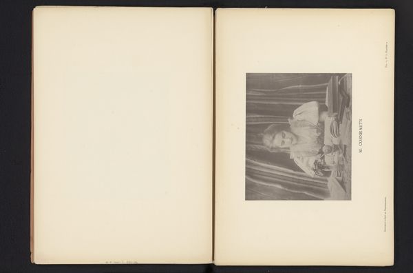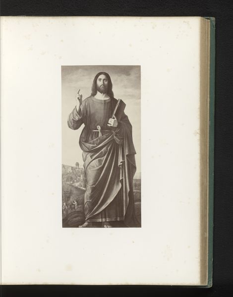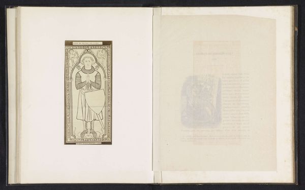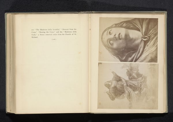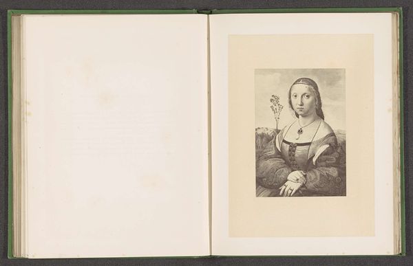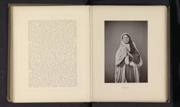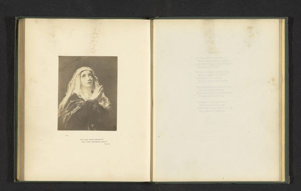 Editor: So, this is a photogravure, a print of a painting called "Fotoreproductie van een prent naar een schilderij van een non door William Boxall," made before 1874. The tonality gives it a rather somber, reflective feel, wouldn't you agree? What do you notice in the composition itself? Curator: Certainly. Observe the carefully arranged planes, establishing depth. The figure is centrally positioned, anchoring the composition, yet the gaze ascends, creating a diagonal that arrests a complete sense of static symmetry. It appears as though a calculated dissonance prevails through the employment of shading. Consider, the effect wrought by the gradations from dark to light in defining her habit. Do these gradations, almost imperceptible, invite closer inspection and thus greater appreciation of line and form? Editor: Yes, the lighting really emphasizes the texture of the fabric and draws your eye upwards. So, you are thinking about the form creating visual interest? Curator: Precisely. Boxall manipulates chiaroscuro, directing focus on the upward gaze. This contrasts with the earthly medium, imbuing the sitter with transcendence. Can you identify a balance between form and function regarding the composition? Editor: Well, her clasped hands create a focal point, and visually pull you back into the composition, counteracting the upward movement. Curator: Exactly. It’s the internal push and pull within the structure itself that makes the piece captivating beyond its representational function. It's through its formal devices, such as light and shadow, perspective, and tonal balance, that it conveys meaning. Editor: That tension definitely adds a layer to the piece. I was initially just seeing a religious portrait, but now, it's the push and pull in form that fascinates me most. Curator: Indeed, appreciating the structure enables a richer viewing experience, revealing complexity beyond the immediately representational.