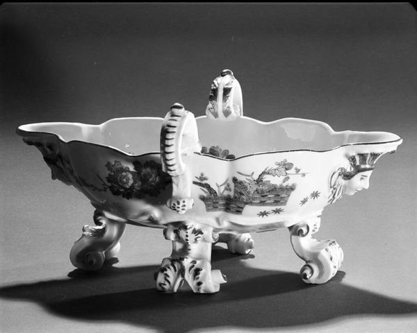 Curator: How exquisite—the porcelain almost glows. It’s a "Saucière" made by the Meissen Porcelain Manufactory. Editor: The delicate patterns make it look like something from a fairy tale. What do you make of it? Curator: The floral patterns and mythical creatures are charged with meaning. Notice the deer, a symbol of grace and gentleness. Editor: Interesting how the handle looks almost architectural, like a miniature monument to the art of sauce making. Curator: Yes, Meissen was all about alchemy—turning base materials into social currency. It's as much about status as it is about sauce. Editor: All this refinement masks the brutal labor required to extract and manipulate kaolin. Were these objects designed to impress or oppress? Curator: Perhaps a bit of both. But it reminds me that even utilitarian objects can reflect profound cultural ideals. Editor: Indeed, and that every stage of production matters. Now I find myself questioning the symbolism behind the sauces themselves.