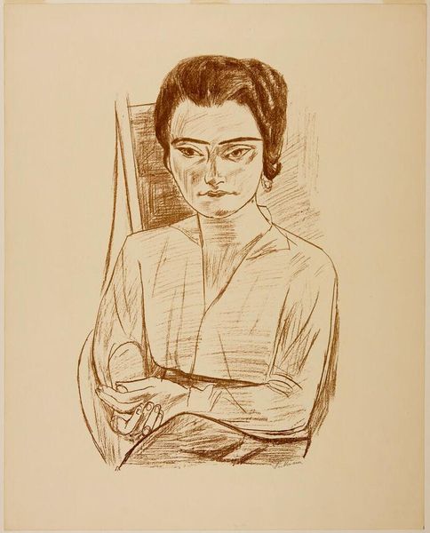 Curator: Immediately, I'm struck by the tenderness of this portrait. There's a real vulnerability in her gaze. Editor: Indeed. This is Edvard Munch's lithograph, "Young Woman with Hand on her Cheek," housed at the Harvard Art Museums. The large lithographic stone allowed for a delicate rendering. Curator: I think that delicacy is key. She seems caught between contemplation and melancholic reflection, maybe even a slight feeling of alienation, so characteristic of Munch's exploration of the female psyche within a patriarchal society. Editor: And it reflects the artistic climate. Lithography allowed for broader distribution, bringing art to new audiences and challenging the established art world. Curator: Absolutely, and the very act of reproducing and circulating this image allows us to reclaim this young woman's narrative and challenge the institutional structures that have historically defined and confined female representation. Editor: Munch's focus was always the interior life of the modern individual, and this work encapsulates that beautifully. Curator: Yes, a reminder of the quiet strength and complexity residing within us all. Editor: A powerful piece, indeed, even in its subtlety.