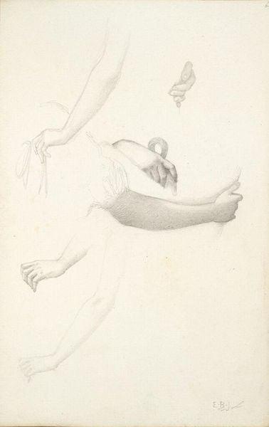 Editor: This is "Studies of Hands for 'The Bath of Venus'; verso: Study for 'Flamma Vestalis'" by Edward Burne-Jones. It's a pencil drawing, quite delicate. What do you make of it? Curator: The materiality of this sketch reveals the artist's process. The paper, the pencil strokes – these are the tools of production. Considering Burne-Jones's larger tapestries, how does this more humble medium inform our understanding of Victorian craft and labor? Editor: So, seeing this as a study, it’s less about the final artwork and more about the artist's method? Curator: Precisely. The repetition of the hand motif suggests the artist is striving for a certain level of refinement, but through a repetitive process of sketching. What do you think it meant for the artist to use a simple pencil in that era? Editor: It's interesting to consider the materials used in relation to the final, often grander, product. I'll remember that next time.
