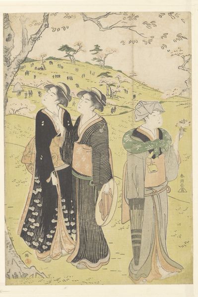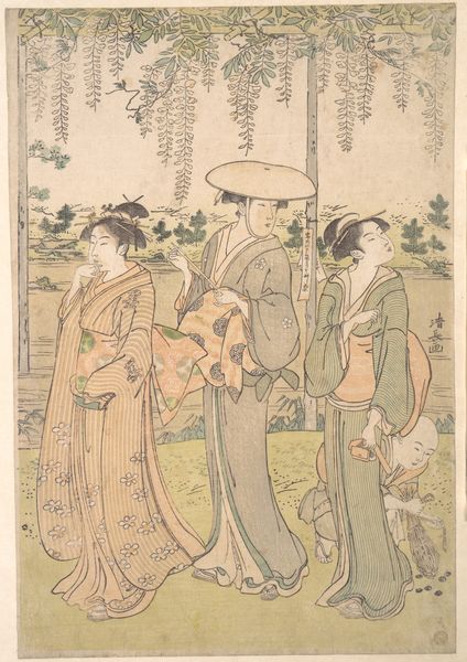 Curator: Here we have "Women Visiting an Inari Shrine," a woodblock print by Katsukawa Shuncho, dating from around 1780 to 1801. The work is part of the Ukiyo-e tradition, focusing on scenes of everyday life. Editor: Oh, I just love the gossamer feel. You know, like a half-remembered dream, all soft edges and delicate colors. It gives me this strange mix of tranquility and wistful melancholy. Curator: The medium is central here: woodblock printing, a complex process involving carving a design into wood, applying ink, and then pressing it onto paper. Consider the labor involved, the artisans who transferred Shuncho’s vision. The production relies on division of labour: Shunsho, as artist; the block cutter; the printer, each contributing distinct skills. The quality of the paper too, plays an unsung part, providing the ground for such elegant articulation. Editor: Absolutely! It's incredible to think of the hands that touched this piece before it reached us. It makes me appreciate the inherent tactility of it, even behind the glass. I wonder about those women... Are they sisters? Friends? What secrets do they share as they visit the shrine? Curator: Ukiyo-e prints were mass-produced and marketed to a broad audience, offering glimpses into entertainment districts, landscapes, and popular culture, including fashionable beauties and shrines. Here, the composition depicts a scene of leisure and religious practice intertwined. We can think about who consumed these images and the cultural values they reflect. Note that prints like this challenged traditional hierarchies, bringing images of the elite within reach of the masses. Editor: I hadn’t really thought of that... the accessibility! It adds another layer to the image; that ordinary folks, like us, were welcome in this world too. Makes you wonder how it informed their dreams, you know? Created possibilities in the imagination…I love how art lets you do that. Curator: And of course, examining the pigments, their sourcing, and the process of their layering – it all connects this aesthetic experience to concrete historical and material conditions. It gives an awareness of production chains. Editor: What began as a fleeting, atmospheric experience leads to broader recognition of what created it: all those hands; even the paper! This takes the experience into whole other levels. Thank you, friend. Curator: The intersection of aesthetics, labour, and consumption; it truly does deepen the appreciation of a work like this.
