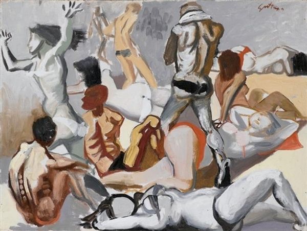 Eric Fischl gave us "Truman Capote in Hollywood" with oil on canvas. The brushwork is loose, almost impatient, like he's chasing a fleeting moment. I think this brings a certain immediacy to the composition. The color palette leans towards muted, fleshy tones, which creates a kind of voyeuristic intimacy. The painting feels like a half-remembered dream of a party scene. Look at the way Fischl handles the light. It's not about perfect rendering; it's about capturing a mood. Notice that figure with their back to us, just out of focus, stepping out of their jeans. The paint is thinned out, scrubbed into the canvas, so it almost disappears. It's a perfect little metaphor for the casual, careless decadence of Hollywood. Fischl's work reminds me a bit of early Lucian Freud, that same interest in the psychological weight of the human figure. But where Freud is all about the solitary, existential angst, Fischl is interested in the awkwardness of social interactions, the tensions simmering beneath the surface of polite society. Art is about asking questions, not giving answers.