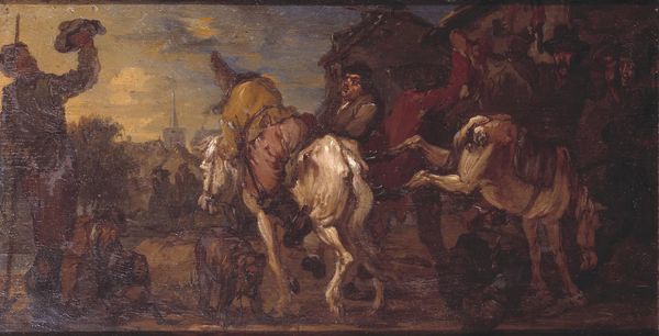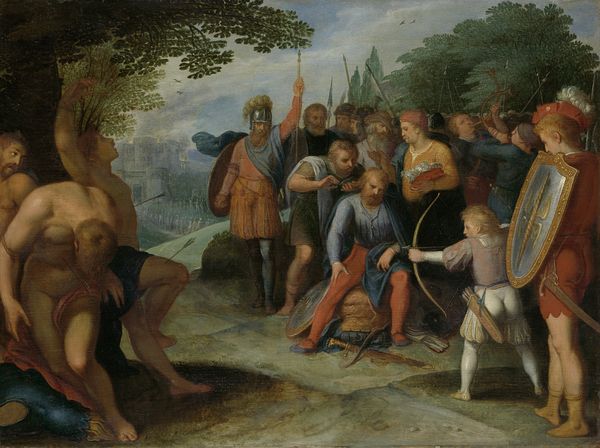 Adam Elsheimer painted this oil on copper piece, "Heraclius on Horseback with the Cross" around 1600. The small scale invites a detailed examination of its densely populated composition and vibrant color. The painting depicts Heraclius, the Byzantine emperor, returning the True Cross to Jerusalem. The formal arrangement is striking. Elsheimer uses a diagonal composition, leading the eye from the lower left to the upper right, heightening the processional aspect of the scene. Note the contrast between the earthly realm, depicted with rich, warm tones, and the celestial sphere above, rendered in cooler blues and whites. This division underscores the painting's theme of divine triumph and restoration. Consider how Elsheimer employs light and shadow to create depth and drama. The figures are modeled with remarkable detail, and each face registers a distinct emotion. This use of light not only enhances the visual impact but also invites a deeper contemplation of faith, power, and redemption. This painting functions as a complex interplay of form and meaning.
