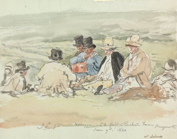 Editor: Looking at Eugène Boudin’s "Trouville," created around 1869, I am struck by the fleeting nature of the scene, almost as if the artist captured a momentary impression. Curator: It is fascinating how Boudin employs loose, almost gestural brushstrokes to render the figures on the beach. Notice how the composition guides your eye toward the horizon. Editor: Absolutely. But for me, it's the material reality of the beach itself, the sand and sea depicted with such evident haste, that really draws me in. I wonder, what kind of pigment mixtures allowed him to create such an effect in what appears to be watercolor and maybe some gouache? Curator: That's astute. Boudin’s approach prioritizes capturing the atmospheric conditions – the light reflecting off the water and the subtle variations in the sky. The figures almost act as visual cues reinforcing spatial depth. There's also a subtle narrative being constructed here with the positioning of certain subjects closer and some receding into the distance. Editor: For me it's less about pure depth and more about that rapid plein-air technique; what does that speed of creation communicate about labor and artistic choice in 19th-century beach town leisure, I wonder? It suggests a casualness belying intense labor to keep pace with rapidly shifting conditions! Curator: An excellent point. I see the materiality and the speed it allowed allowing Boudin to suggest transience as an essential element within the social life it represented. A meditation upon how fleeting social pleasures and moments can become within larger, temporal structures! Editor: Right. And those material and economic forces were enabling and constraining that class's leisure. Watercolor may have also provided greater opportunities to paint quickly and cheaply for audiences demanding speed and responsiveness in art making. Curator: True. This small work provides great insight into not just Impressionism, but also to understanding mid-19th-century aesthetic concerns about representing contemporary social realities. Editor: Indeed. A remarkable testament to how art's creation, and the economics behind the creation, captures something otherwise unseen.
