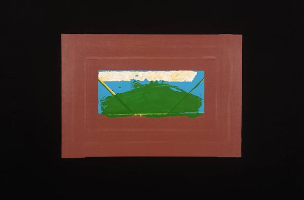 Editor: This is Howard Hodgkin's "Indian View D," and the Tate holds it in their collection. The splash of green paint against the neutral ground feels both chaotic and contained. How do you interpret this work in its historical context? Curator: Hodgkin, though British, had a deep engagement with India. The "Indian Views" series highlights the artist's emotional response, rather than a literal depiction. Consider the socio-political implications of a Western artist interpreting Indian landscapes. Editor: So, it's less about representing India accurately and more about Hodgkin's personal experience within that cultural space? Curator: Precisely. The abstract nature removes the pressure of objective representation, allowing Hodgkin to explore the sensory impact of India on his identity and artistic practice. Do you think the abstraction enhances or detracts from its cultural significance? Editor: It definitely prompts more questions than answers, which makes it thought-provoking. Thanks! Curator: Indeed. It challenges us to consider the politics inherent in viewing another culture.