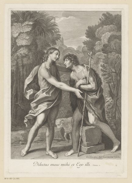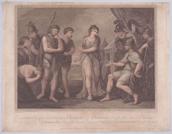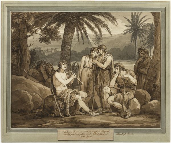 Curator: Standing here, what strikes you first about this scene, Editor? To me it whispers of quiet kindness and almost bashful hospitality. Editor: It feels… staged, Curator. Impeccably posed. Like a tableau vivant about to spring into action, all frozen at the crucial moment of revealing the "other." The nude figure, of course, grabs the immediate attention. Curator: Quite. Wilhelm Marstrand, back in 1835, immortalized this particular moment from the Odyssey in his painting, "Nausikaa bringer den skibbrudne Odysseus klæder," or, Nausicaa Giving Clothes to the Shipwrecked Odysseus. Editor: Right, a pivotal scene of care. But the dynamics are charged. These women, presumably attendants of Nausicaa, appear apprehensive or perhaps even repulsed by this unkempt, naked man. It speaks to ingrained prejudices around class and appearance, even when offering help. How civilized is civilization, really? Curator: Absolutely. But I find something disarming in the gentle tilt of Nausicaa's head, the graceful extension of her hand, guiding, yet not imposing. Almost an invitation to step away from those anxieties, both for Odysseus and the others. It makes me think of those fleeting instances of grace that puncture our own anxieties. Editor: I see your point, but I am left wondering: Is Odysseus's vulnerability only acceptable within very specific patriarchal framings, or is it truly a gesture of empathy? The subtext here raises questions that feel painfully contemporary. Does offering charity erase deeper power imbalances? Does it implicate everyone? Curator: It's those layers, those nagging questions beneath the smooth brushstrokes of neoclassical history, that give the artwork its longevity and appeal, even today. The scene itself acts as a canvas on which to contemplate those difficult ethical equations. Editor: Agreed. And perhaps that is its quiet power. We gaze at it, charmed, yet uneasily aware of all the silent tensions rippling beneath the surface. A complicated and uneasy truce frozen in time, indeed.