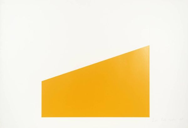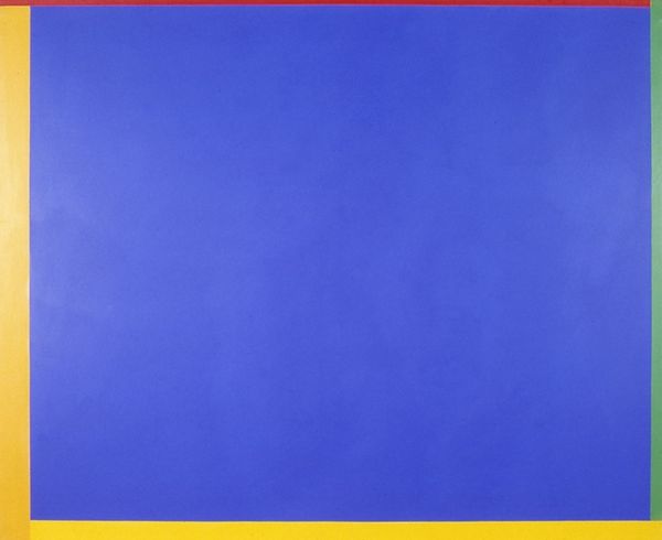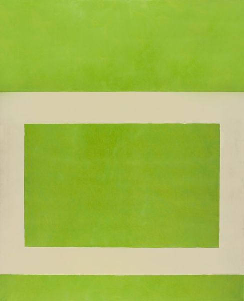 Curator: I find myself immediately drawn to the vibrant simplicity. It’s a bold declaration using minimal means. What do you see, Editor? Editor: It's arresting. Stark. At first glance, it appears to be almost aggressively straightforward. Yet there is also something pleasing and approachable in the symmetry. This "Untitled" acrylic painting, created by Jeremy Moon in 1972, feels deeply rooted in its historical moment. Curator: It absolutely speaks of its time, doesn’t it? The colors feel like a direct conversation with the Pop Art movement. But tell me more about what you mean by rooted in its time. Editor: The hard-edge painting style is undeniable. And this idea of removing the artist's hand, of striving for objective perfection and flawless execution—that resonated powerfully during the peak of high modernism, when the art world's institutions promoted abstraction. How do you think the artist thought to incorporate patterns and geometric shapes at that time? Curator: I think Moon tapped into something very primal, reducing form to these very basic elements, exploring pure relationship. Lines, for instance, often symbolize boundaries, pathways, and connections, but here they feel almost...deconstructed. Editor: Deconstructed indeed. The pink rectangle is off balance, the geometry doesn't enclose the painting to provide that sense of "perfection," so to speak, even despite itself. But it’s interesting to view this kind of art that almost shuns overt symbolism, and question the role that visual culture can have in art from the 1970s. Curator: The almost meditative quality comes to mind when faced with such large color fields. Editor: Definitely meditative. It strips away distraction. It reduces form and composition. It reflects its political roots during modernism by not being overly flashy or excessive. Curator: A visual haiku of sorts, stripping away everything except its barest essence. Editor: Precisely. And situating this minimalist declaration within the artistic dialogues of its era really illuminates how Jeremy Moon's abstract vision helped shaped it. Curator: Indeed. Viewing its simple power provides a lens to think through broader strokes in modernism.