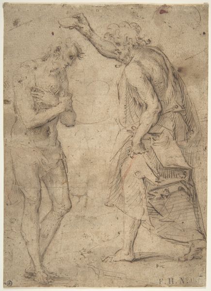 Curator: Look closely at Hendrik Krock's pencil drawing, "Standing Soldier and Kneeling, Pointing Youth," believed to have been created sometime between 1671 and 1738. Editor: My first impression is that it is an evocative composition despite the sketch-like quality. The figures' gestures convey a distinct narrative—something heroic yet perhaps fraught with tension. Curator: Indeed. The standing soldier, adorned in armor, appears almost stoic, while the kneeling youth passionately gestures, perhaps pleading or directing. Krock's choice of stark, contrasting figures speaks volumes. What do these characters represent? The soldier’s garb immediately situates him as a figure of authority. It's the embodiment of power. Editor: And who exactly is the empowered figure protecting and defending? And against what? He isn’t even looking at what is so emphatically being called out by the other figure. I agree there's a contrast, perhaps indicative of class difference or social status; there is an inequity on which the entire scene seems to hinge. Curator: Krock, working within the Baroque tradition, might be exploring archetypes of leadership and obedience, power and supplication, with visual motifs passed down from the Classical age. Note the use of light and shadow. Editor: Right. Baroque art often used these contrasts to highlight dramatic moments. Are we to believe there are two easily separated characters, good/bad, powerful/powerless? Or is Krock urging us to reflect on their relational being, how one only exists with the presence of the other? That perhaps the man in armor's authority can only exist by pointing in sharp relief to the kneeling one. Curator: Perhaps, given its nature as a study or sketch, Krock might have been teasing out his ideas, searching for symbolic arrangements to carry meaning. What narratives resonate through this encounter across the ages? The military-esque attire the central standing figure is wearing is not accidental, its use here has everything to do with it! Editor: Ultimately, it challenges us to unpack these dynamics and question what seemingly disparate positions mean both individually and intersectionally. This piece is much more than a simple depiction of two figures. Thank you for that insight!
