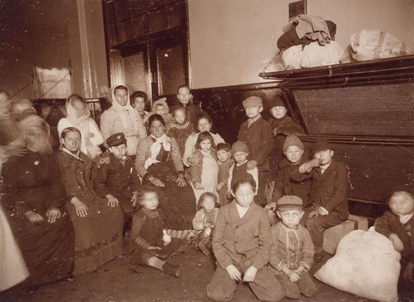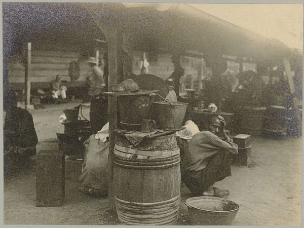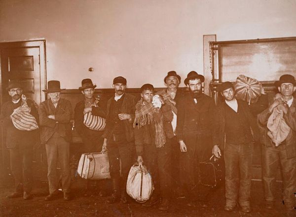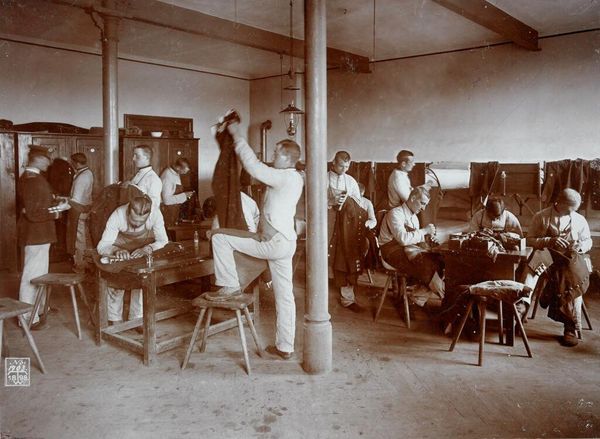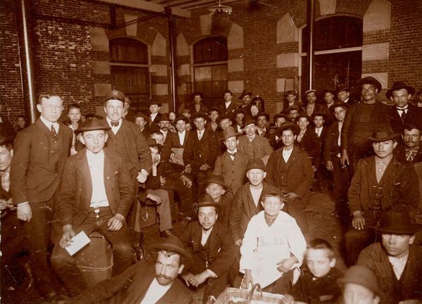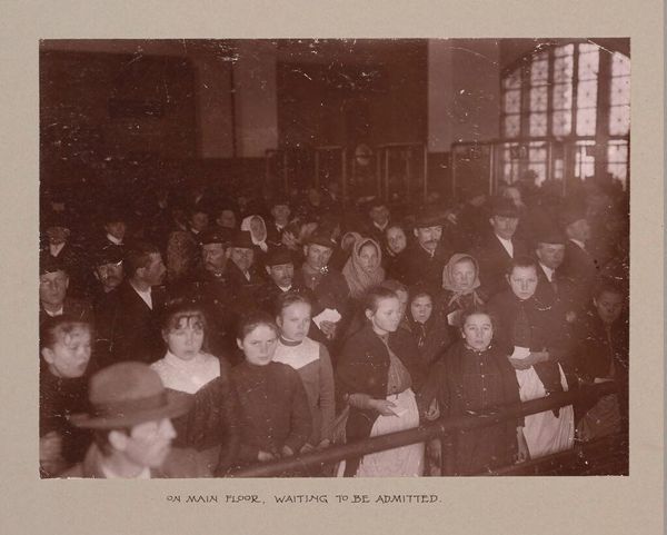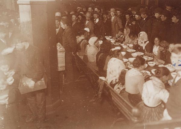 Editor: This photograph, "Races, Immigration: United States. New York. New York City. Immigrant Station: Regulation of Immigration at the Port of Entry. United States Immigrant Station, New York City. New York Detained Group: Men at Dinner," by J.H. Adams, depicts a large group of men eating. The sepia tone gives it a somber, historical feel. What historical context informs this image? Curator: The image speaks volumes about the immigrant experience at the turn of the century, particularly the institutional processing and, at times, dehumanization, inherent in immigration. Notice the lack of individuality encouraged through the image’s composition. Editor: It does feel very regimented. How did these stations shape the narrative around immigration? Curator: Stations like these were crucial in controlling and shaping the narrative of who was "worthy" to enter the United States. The image shows us a controlled environment, a place where immigrants were processed and observed. What do you make of their expressions? Editor: There’s a weariness, but also a resilience. I see how this image captures a complex moment in American history. Curator: Precisely. It forces us to confront the politics embedded in the very act of documenting immigration.