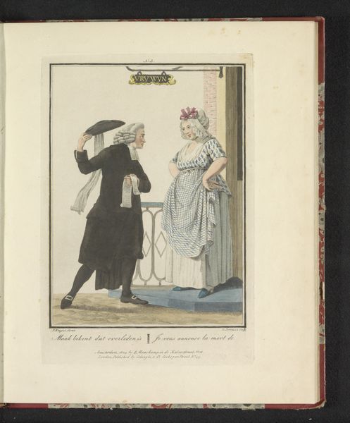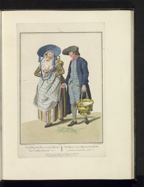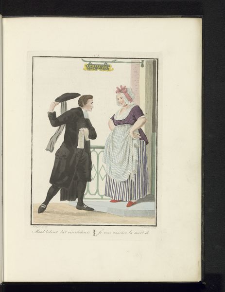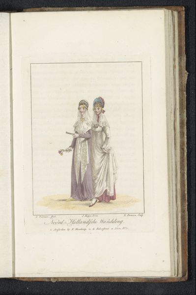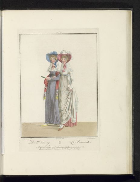 Editor: So, this drawing by Ludwig Gottlieb Portman, titled *Two Girls from North Holland*, made with watercolor on paper sometime between 1807 and 1829, feels like a quiet glimpse into another time. The detailed costumes are really striking. What stories do you think these clothes and the scene might be telling? Curator: Indeed! Look closely at how those meticulously rendered costumes place the wearers within a specific time and place, carrying visual cues about their identity and social standing. Consider, too, the subtle dynamics between the figures – one reading aloud, the other listening intently. What unspoken messages do you find within their interaction? Editor: Well, one girl's sitting down reading the letter, the other is standing next to the bench kind of leaning in, listening... perhaps they're friends sharing a personal moment? Maybe the letter holds exciting news? Curator: Perhaps. Now, consider what it meant to capture such scenes at that time. Genre paintings, like this, started to emerge depicting scenes from everyday life. Could it be an interest in recording the culture and costumes? What kind of value would everyday representation have held? Editor: Hmmm... Maybe it's about celebrating regional identity? This *is* specifically about girls from North Holland, so maybe showing the distinctive elements of their clothing and life was something new and interesting. Curator: Precisely! The clothing, setting, and interactions aren't merely decorative, but carry symbolic weight. They become a form of cultural preservation, fixing a moment in time andmemory through visual representation. Editor: It’s like a little piece of history, carefully documented. I guess art really can capture a lot more than just what’s on the surface. Curator: Exactly! The clothing is so fascinating - how it marks social class and how the relationship is equally captured within that scene. A fleeting moment turned into something with lasting impact, don’t you think?