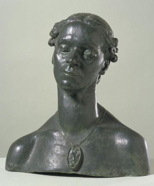 Curator: The poise and quiet intensity of the figure really strikes me. Editor: Indeed. What we're observing is "Bust of a Woman," a bronze sculpture crafted in 1851 by Charles-Henri-Joseph Cordier, now residing at The Art Institute of Chicago. Curator: Bronze is so telling here; its surface appears both weighty and sensuous, but more than that I find the gaze so compelling, almost as if she's locked in thought, or turned inwards. Editor: That weight, that feeling, comes from the labor embedded within the lost wax casting process. Every mark, every ridge is a testament to the artist's hand, and those of the foundry workers who shaped and molded it. Note the artist’s detailed capturing of her locs or braided hair style that gives texture and an intimacy not always achieved by sculpture during that period. Curator: Absolutely, the formal realism contrasts intriguingly with its ethnographic purpose. Her draped clothing and jewelry become signifying components, adding layers of complexity to the composition. I would love to know the role of colonialism during the advent of such striking artwork? Editor: I couldn’t agree more. Consider also Cordier’s use of patination on the bronze and how the final result gives it a unique look; this approach was part and parcel of bringing into focus artistic intentions about race. One can almost imagine this object existing in a domestic, wealthy interior with colonial trade in mind. It really makes one pause for thought around commerce in 1851. Curator: I am thinking about its lasting formal power – a confluence of realism and idealization rendered in enduring material, which makes for a potent expression on a grand scale. Editor: And I am here just seeing and sensing hands – the material transformations tell volumes, revealing the confluence of skill, labor and a fraught era.