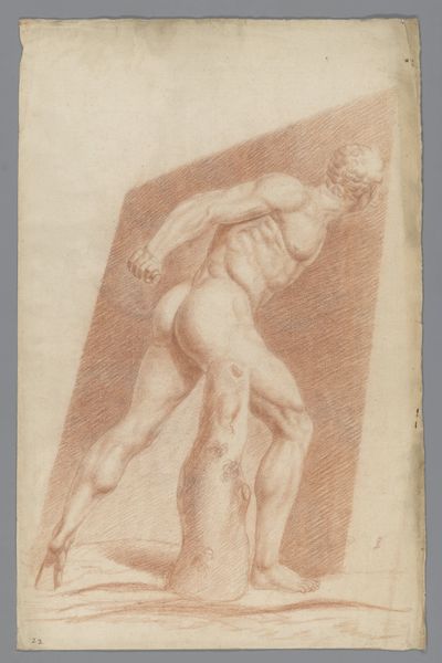 Editor: Here we have "Schwebende Amorette nach rechts", a drawing attributed to Annibale Carracci, ink and chalk on paper. The figure appears dynamic, though the lines seem quickly sketched. What draws your eye to this particular drawing? Curator: Immediately, the asymmetry commands attention. Note the deliberate imbalance. The cupid's weight shifts drastically, creating a diagonal tension. Consider the placement of the limbs, the implied movement… Does it not suggest a deeper structural significance? Editor: It does seem like the body is caught in mid-motion, although it also has a raw, unfinished look, wouldn’t you say? Curator: Precisely! The unfinished quality enhances its semiotic power, you could almost call it gestural, in spite of its classical form. This deliberate openness compels the viewer to engage with the artistic process itself, rather than merely observing a completed form. Notice also the tonal gradations created by the chalk – not for realism, but for depth and emphasis. It emphasizes the volume while simultaneously negating it, denying complete form in favour of process. What do you make of that ambiguity? Editor: So, rather than focusing on the cherub's story or symbolic meaning, we look at how the drawing itself communicates a sense of movement and form, through lines, shading, and maybe what's even left unfinished? Curator: Yes, our goal is not to simply decode what's represented, but how that representation takes place through form. Only then can we understand the artistic intention and its implications for interpretation. The act of creation, not the created subject. Editor: That’s given me a completely new perspective! Thank you. Curator: You're welcome. It's rewarding to consider the dynamic relationship between form and meaning, don’t you agree?