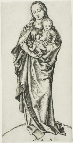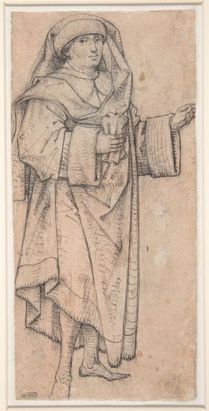 Lucas Cranach the Elder created "Standing Woman," a small woodcut, during the early 16th century. Cranach, a court painter deeply embedded in the social and political milieu of the German Renaissance, crafted images reflecting the era’s evolving attitudes toward status and identity. This print encapsulates the visual language of the period, particularly regarding the representation of women and their prescribed roles. The woman's elaborate attire, especially the ornate headdress, signals her elevated social standing, reinforcing the importance of aristocratic lineage in the art of the time. The gaze is direct, assertive, claiming space within a visual culture that often sought to minimize the individual identities of women. The image serves not only as a portrait but also as a commentary on the performance of femininity within the confines of class and expectation. It invites us to consider the complexities of representing identity and the negotiation between individual expression and social norms.