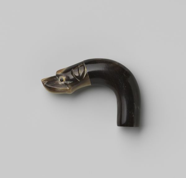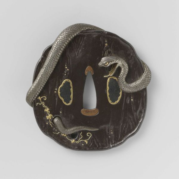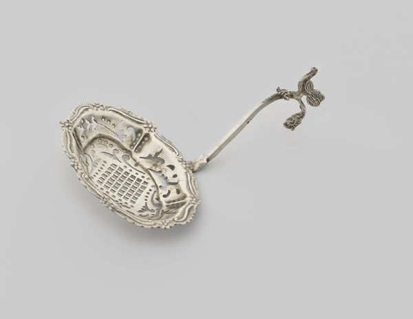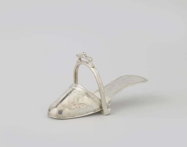 Editor: Here we have a silver clip, "Aronskelk," or arum lily, created around 1935-1936 by Firma Gaillard. It also features a milky white chalcedony. It feels very sculptural, but also quite delicate. What strikes you about this piece? Curator: The compelling feature resides in the interplay between form and texture. Observe how the hammered silver creates a tactile surface, contrasting with the smooth, faceted chalcedony. This juxtaposition underscores the art deco aesthetic. Editor: Art Deco, certainly. I also notice the elegant curve of the silver. Does that contribute to the overall design? Curator: Precisely. The curved lines, characteristic of the arum lily, are elongated and stylized. Notice how the artist captures the essence of the flower rather than providing a literal representation. Consider the use of positive and negative space – how the open area around the chalcedony accentuates the form of the silver. Editor: That’s a good point. So, it's not just about what *is* there, but what *isn't*. Is there a meaning or intention in the choice of these materials, silver and chalcedony? Curator: One must consider their material properties. Silver offers malleability, allowing for detailed shaping, while chalcedony introduces a milky translucence that catches the light. The reflective quality of silver plays with the diffused glow of the gemstone. Editor: Fascinating. I see the piece in a completely new light, paying attention to its design and textures now. Curator: By engaging with the inherent properties and relationships of formal elements, one arrives at a deeper aesthetic understanding.
