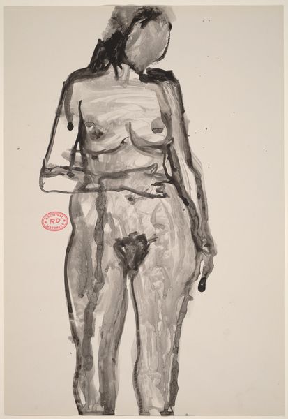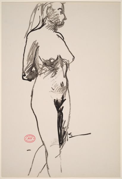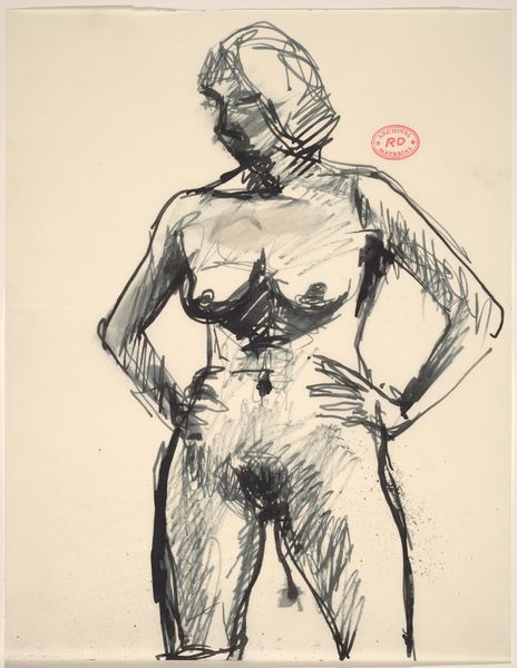 Editor: This is an ink drawing by Richard Diebenkorn, made sometime between 1955 and 1967, titled "Untitled [standing female nude with arms akimbo]". The starkness of the ink really emphasizes the figure’s pose. What do you see in this piece? Curator: I see a critical engagement with the tradition of the nude. Diebenkorn disrupts the idealized, often male-gaze-dominated representation. How does the woman’s posture – hands on hips, almost confrontational – challenge conventional depictions of femininity? Is she inviting the gaze, or resisting it? Editor: I see what you mean. There's a kind of boldness to it that I don't always associate with nudes. Curator: Exactly! Consider also the time period. This work emerges during a period of intense social upheaval, of evolving feminist discourse. It makes me think about questions of agency. Who has the right to represent whom? And what does it mean to depict the female form outside of established patriarchal norms? How does this drawing challenge us to reconsider the power dynamics inherent in the act of looking? Editor: That's a totally different way to look at a nude. I'd been focusing more on just the formal aspects of the composition. Curator: Formal qualities are crucial, but we must ask: What ideologies do those forms serve, or subvert? What conversation is Diebenkorn trying to have with viewers through this female nude, during that era, and in our present moment? Editor: This has definitely given me a new framework to think about figuration in art. Thanks! Curator: My pleasure! Remembering that art never exists in a vacuum lets us uncover complex relationships between the artwork, its creator, and ourselves.