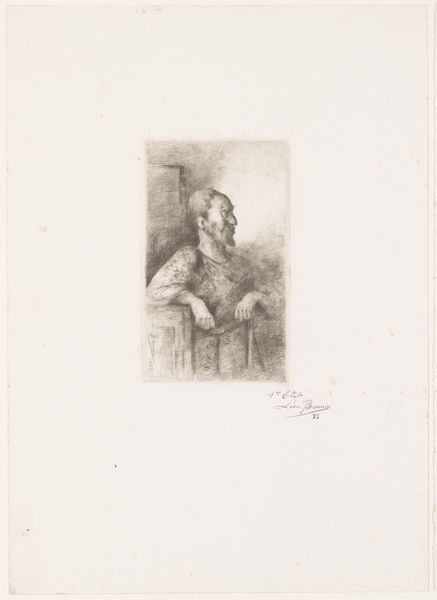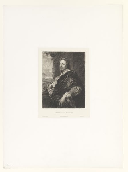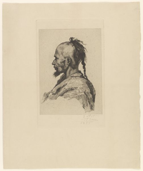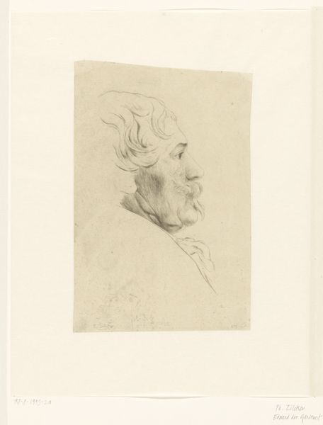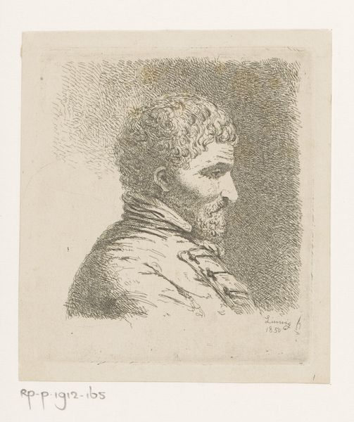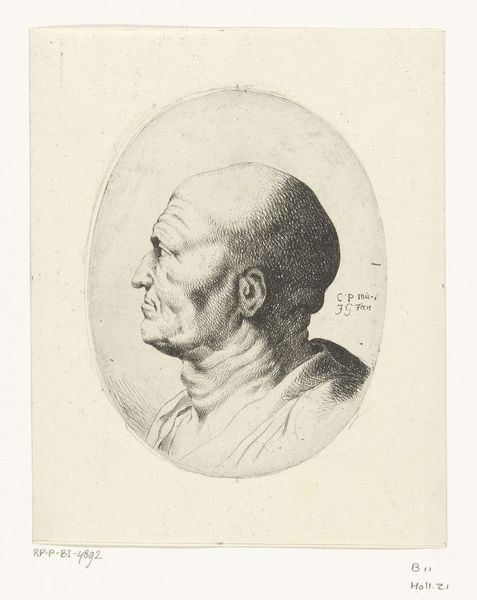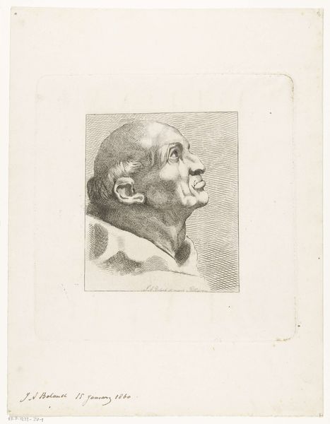 Curator: Immediately, I'm struck by a sort of mournful theatricality in this portrait. Is that just me? Editor: Not at all! Let's orient our listeners. What we're viewing is titled "Bust of an Old Man with a Large Collar and Hook Nose," a print likely dating between 1744 and 1749, crafted with etching and engraving techniques. Christian Ludwig von Hagedorn is the artist. Curator: Oh, "Bust of an Old Man…" They’re so literal sometimes, aren’t they? But “hook nose” indeed—the defining feature! It's like the artist seized on caricature to highlight, or perhaps exaggerate, the contours of age. The collar adds a performative element to the sitter. Editor: It's a wonderfully observed character study. Observe how the density of cross-hatching articulates form and texture: the delicate wrinkles, the wisps of hair… Note the formal structure underlying the impressionistic rendering of age. Curator: And he’s leaning back ever so slightly, his mouth is open, is he holding forth? Or maybe just sighing? There's a vulnerability there that's compelling, maybe even poignant, especially considering the bold lines of the printmaking. It's Baroque drama on a small scale. Editor: Precisely. Hagedorn uses the print medium to push the contrast. There is high tenebrism with a dynamic composition. Notice the stark play between the man's shadowy figure and the light reflecting off the ruff. Formally it’s all quite balanced, but not static! The asymmetry of the figure adds depth and momentum. Curator: A perfect visual symphony for the ear as well, if I dare say. One can almost hear the scratch of the needle creating this arresting, fleeting image. Editor: An unforgettable union between subject and artistry that keeps echoing.