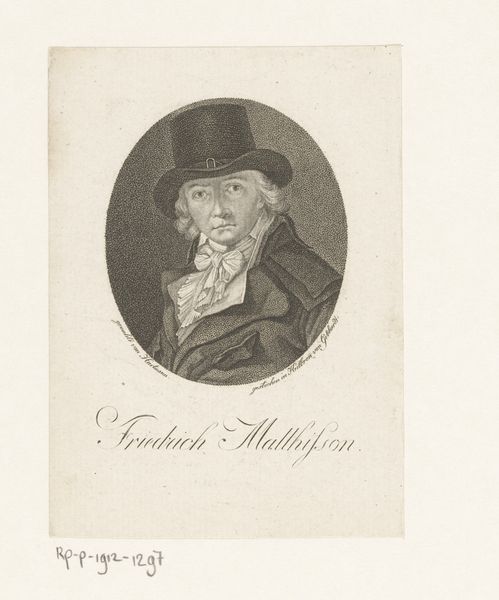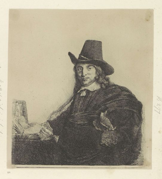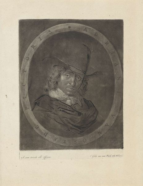 Curator: This is Francisco José de Goya y Lucientes' self-portrait, titled simply "Francisco Goya y Lucientes, Pintor", housed here at the Harvard Art Museums. Editor: There's something about the stark contrast that gives it an almost theatrical quality, doesn't it? The hat especially – it's such a strong, almost cartoonish symbol of status. Curator: Absolutely. The hat, the angle of his face, there's a pride there, but also a hint of melancholy. The text below, "Pintor" or "Painter", is so assertive, like a pronouncement of identity. Editor: And yet, he presents himself in profile, almost as if he’s holding something back from us. The gaze is averted. Was he reflecting on his societal position? Curator: It's Goya staking his claim to posterity, using his own image as a symbol of artistic authority. And that hat, well, it becomes his trademark, a signifier of the artist. Editor: A fascinating assertion of self, carefully constructed for the ages. Curator: Precisely, a persona etched in ink.