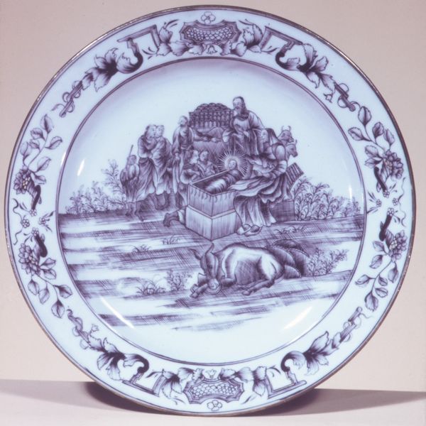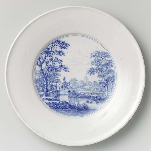 Editor: We’re looking at "Dish with a Landscape" made by Frederik van Frytom around 1670-1685. It’s earthenware with a ceramic glaze, and depicts a serene landscape in shades of blue. There's such incredible detail in the trees and figures on something meant to hold food. What do you see in this piece that speaks to the culture of the time? Curator: It’s fascinating how utilitarian objects can become vehicles for complex social narratives. The prevalence of landscape scenes on Delftware dishes like this isn't accidental. It reflects the rising urban mercantile class in the Dutch Golden Age, their increasing wealth, and a growing desire to own images reflecting the Dutch countryside and their place within it. How do you see that playing out in this composition? Editor: Well, I notice how the scene feels almost idyllic, a little romanticized. Maybe the rising merchant class was trying to project a certain image of themselves? Curator: Precisely. The artist provides a calming, controlled vision of the land. Note how the human figures, though present, are scaled down. Dutch Golden Age landscapes helped create a national identity deeply intertwined with the land, and the wealthy merchant class heavily invested in and profited from that landscape. Dishware became another method of claiming this national image for oneself. Editor: So this seemingly simple dish speaks to larger issues of class, national identity, and the idealization of nature. I’ll definitely see these landscapes differently now. Curator: And that’s the power of understanding art within its socio-historical context. Hopefully next time you'll reflect on whose voices or activities are not represented!